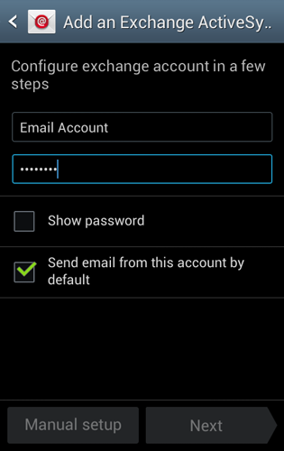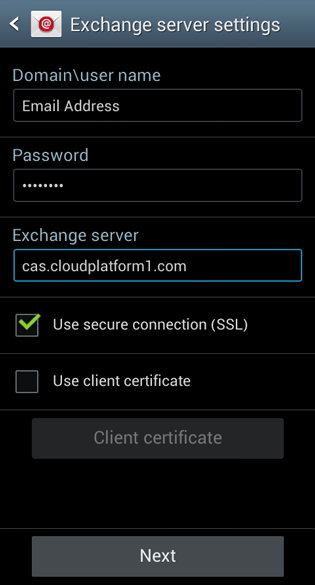 4. Verify the Exchange server settings are correct, and touch 'Next'
