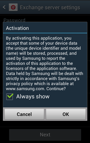 5. Review the 'Activation' screen. Un-mark the 'Always show' option if you do not want to see this message again when setting up an ActiveSync account, and touch 'OK'