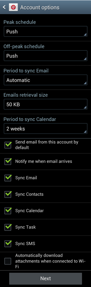 - Peak schedule: Choose how often your device should connect to the Exchange server to get email during peak business hours. Choose Push to have email delivered to your device as soon as it arrives on the server