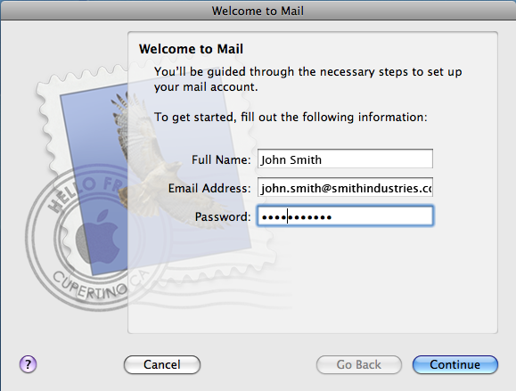 When Opening Mac Mail for the first time you will be greeted by the below screen. Here you will need to input your personal details: